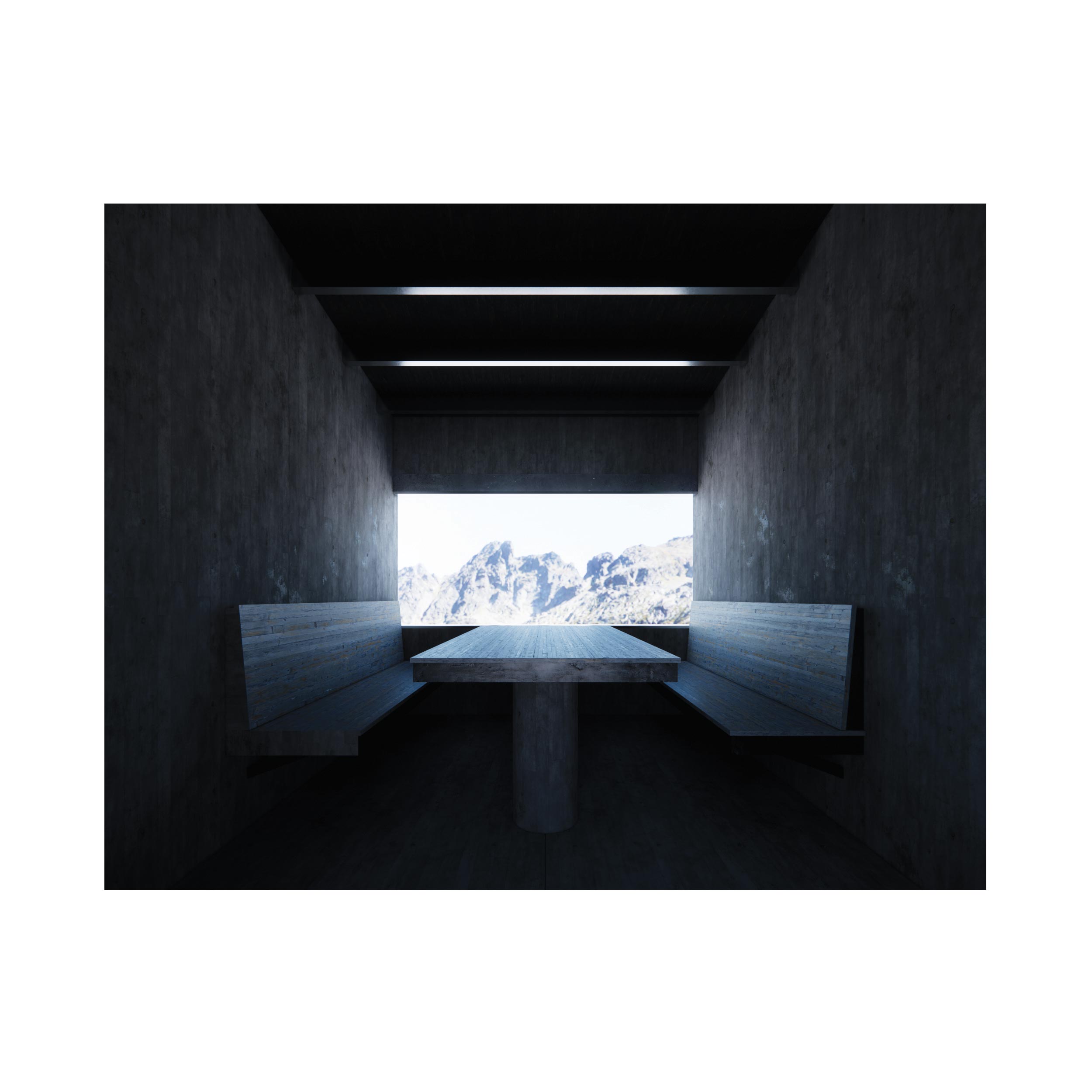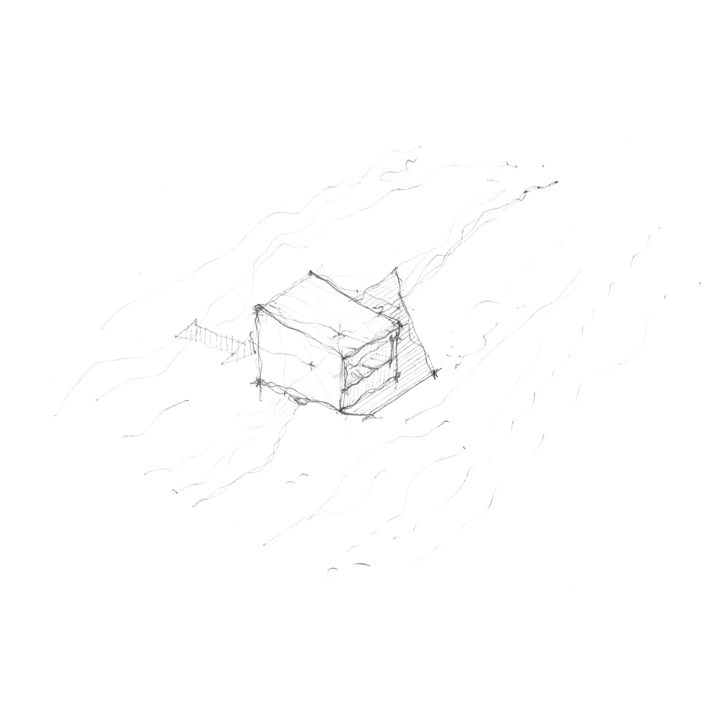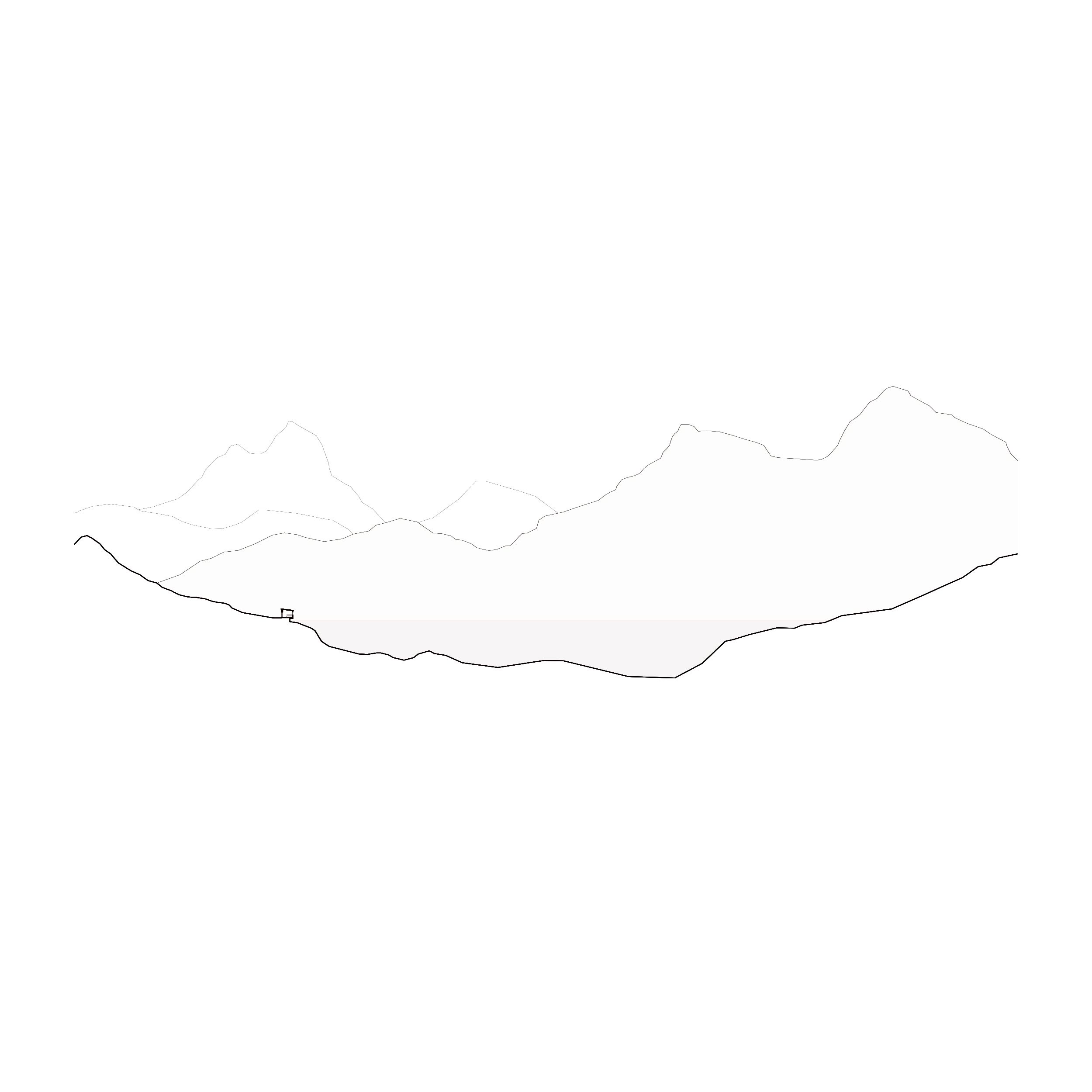 Tras un largo camino de ruta de subida, se necesita un punto donde descansar y poder recargar energías. Acabado el recorrido de llegada al lago, se proyecta un volumen brutalista que canaliza y enmarca las visuales al espectador. Entrar en el habitáculo ampara a la persona del clima y ayuda a centrar la vista hacia la perpendicular del agua.