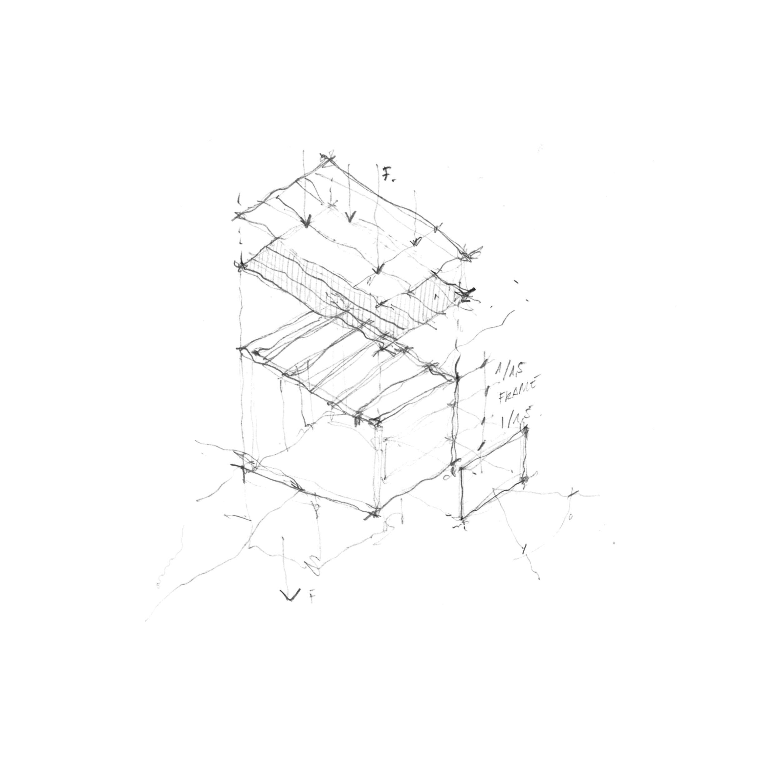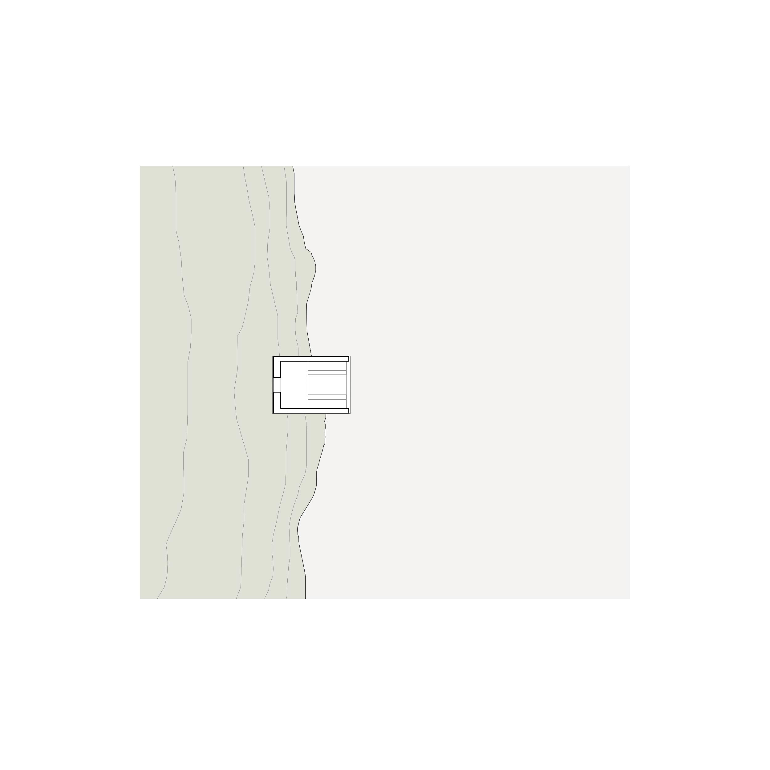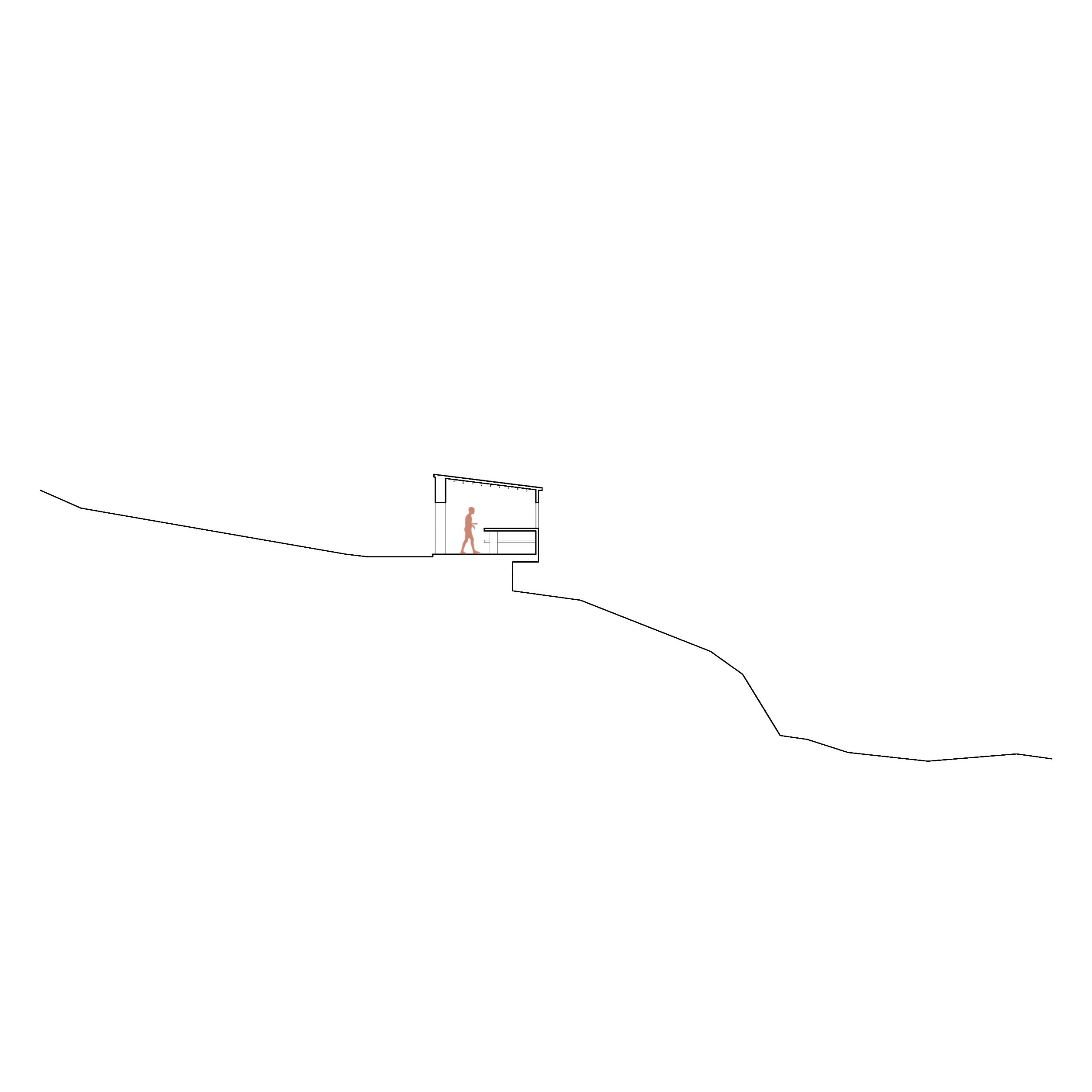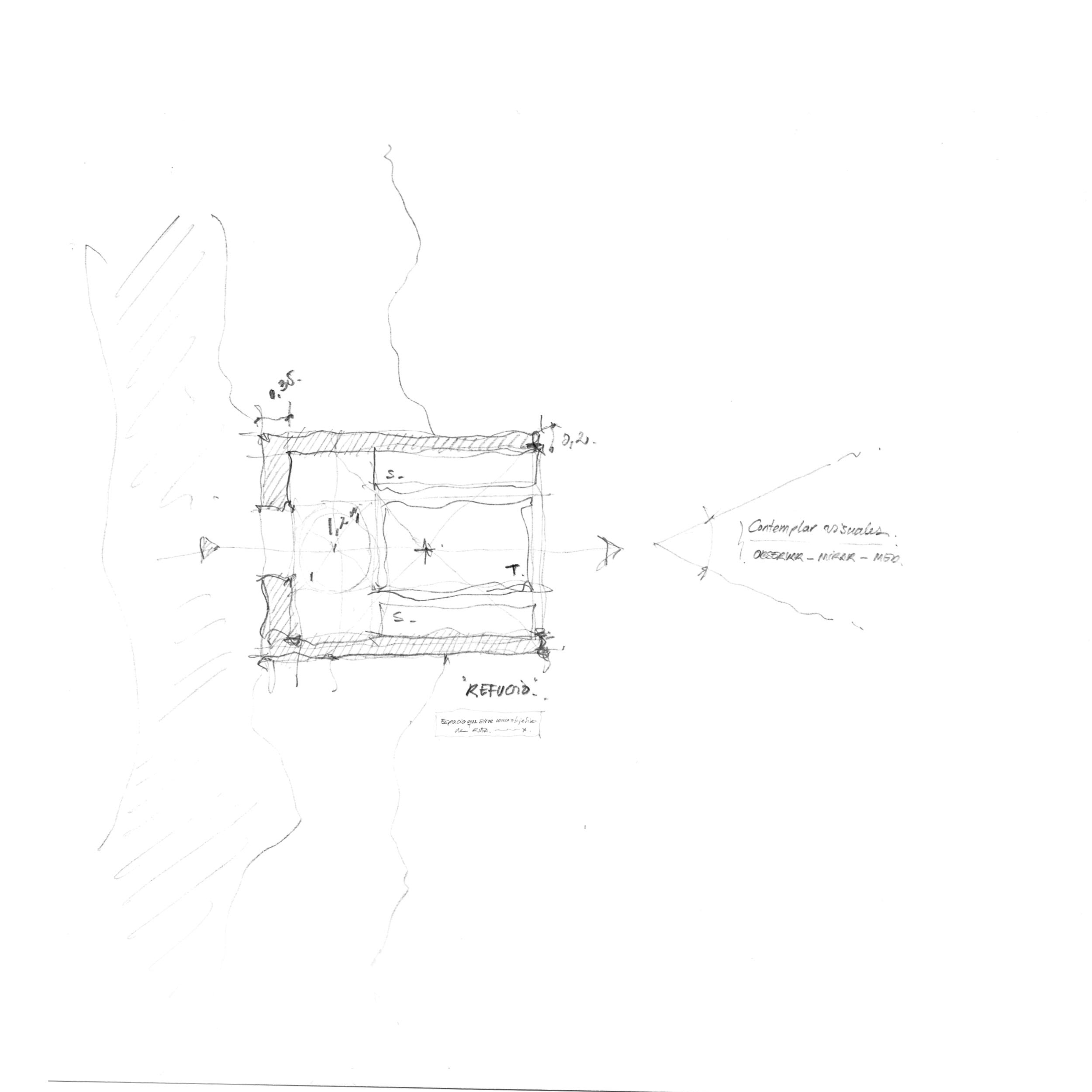Tras un largo camino de ruta de subida, se necesita un punto donde descansar y poder recargar energías. Acabado el recorrido de llegada al lago, se proyecta un volumen brutalista que canaliza y enmarca las visuales al espectador. Entrar en el habitáculo ampara a la persona del clima y ayuda a centrar la vista hacia la perpendicular del agua.